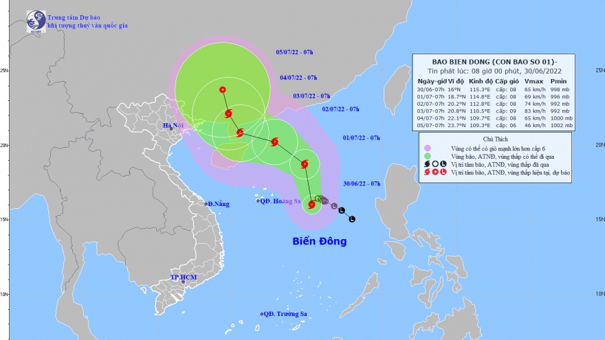 VOV.VN - Hồi 19 giờ ngày 30/6, vị trí tâm bão ở vào khoảng 16,7 độ Vĩ Bắc; 115,0 độ Kinh Đông, cách quần đảo Hoàng Sa khoảng 370km về phía Đông.
