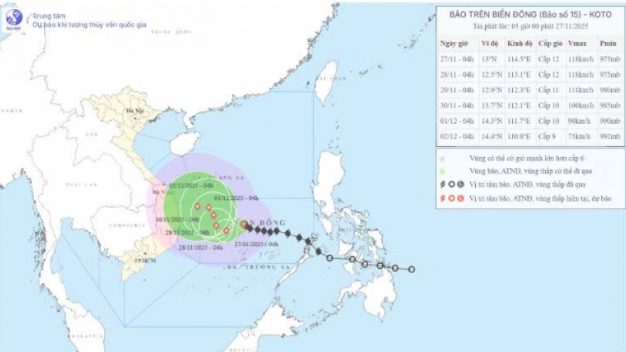 VOV.VN - Bão số 15 (Koto) trên Biển Đông đang có diễn biến phức tạp, liên tục mạnh lên và có thể đạt cực đại giật cấp 14. Hiện tâm bão cách đảo Song Tử Tây khoảng 280km và đang hướng Tây Tây Bắc với tốc độ 20km/h, gây gió mạnh, sóng lớn 7–9m và biển động dữ dội tại khu vực giữa Biển Đông trong những ngày 27–28/11.