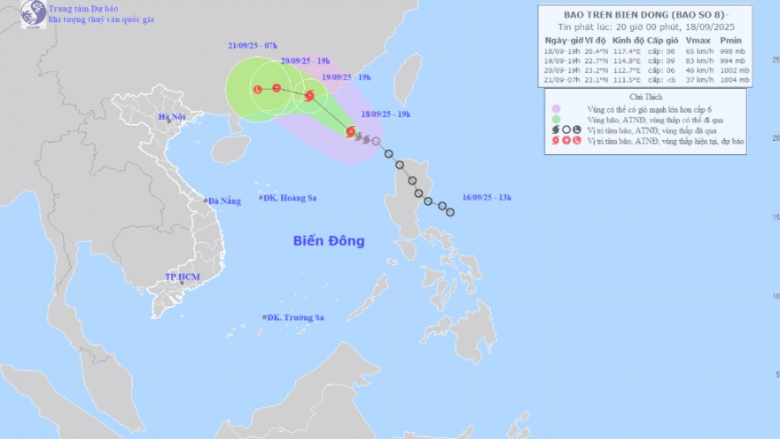 VOV.VN - Theo Trung tâm Dự báo Khí tượng Thủy văn Quốc gia, lúc 19h ngày 19/9, bão số 8 đã đi vào đất liền phía Nam tỉnh Quảng Đông với sức gió mạnh cấp 8–9, giật cấp 11. Dự báo trong 24 giờ tới, bão sẽ suy yếu thành áp thấp nhiệt đới và tiếp tục đi sâu vào nội địa.