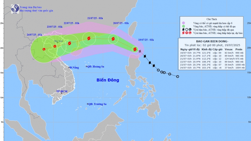 VOV.VN - Theo Trung tâm Dự báo Khí tượng Thủy văn Quốc gia, hồi 1h ngày 19/7, bão Wipha đang ở khoảng 19,7°N – 121,5°E, trên vùng biển phía Bắc đảo Lu Dông (Philippines). Gió mạnh nhất cấp 9 (75–88km/h), giật cấp 11, di chuyển theo hướng Tây Bắc, tốc độ khoảng 20km/h.