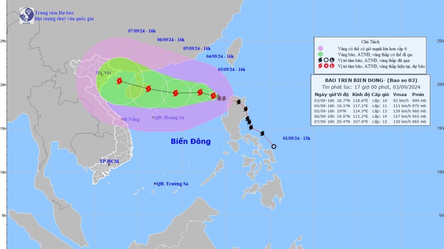VOV.VN - Hồi 16h ngày 3/9, vị trí tâm bão số 3 ở vào khoảng 18,7 độ Vĩ Bắc; 118,6 độ Kinh Đông, trên vùng biển phía Đông khu vực Bắc Biển Đông. Sức gió mạnh nhất vùng gần tâm bão mạnh cấp 10 (89-102km/h), giật cấp 12, di chuyển theo hướng Tây Tây Bắc, khoảng 15km/h.