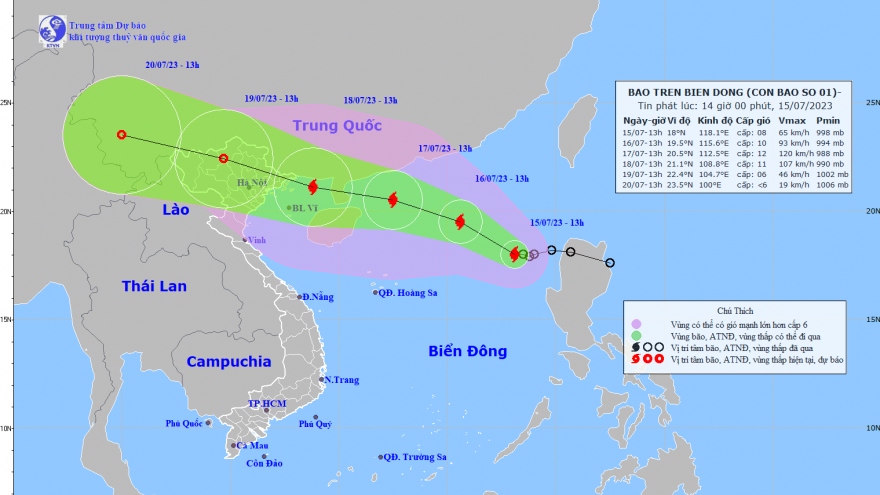 VOV.VN - Hồi 7h ngày 16/7, vị trí tâm bão số 1 ở vào khoảng 19,0 độ Vĩ Bắc; 116,3 độ Kinh Đông, cách bán đảo Lôi Châu (Trung Quốc) khoảng 670km về phía Đông Đông Nam.