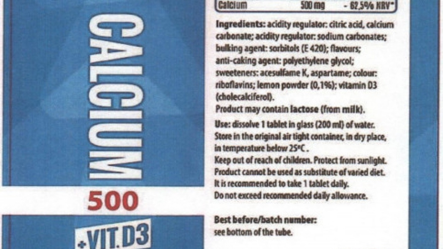 VOV.VN - Cục An toàn thực phẩm (Bộ Y tế) phát thông tin cảnh báo về lô sản phẩm thực phẩm bảo vệ sức khỏe CALCIUM 500 + VIT. D3 có chứa 2-chloroethanol.