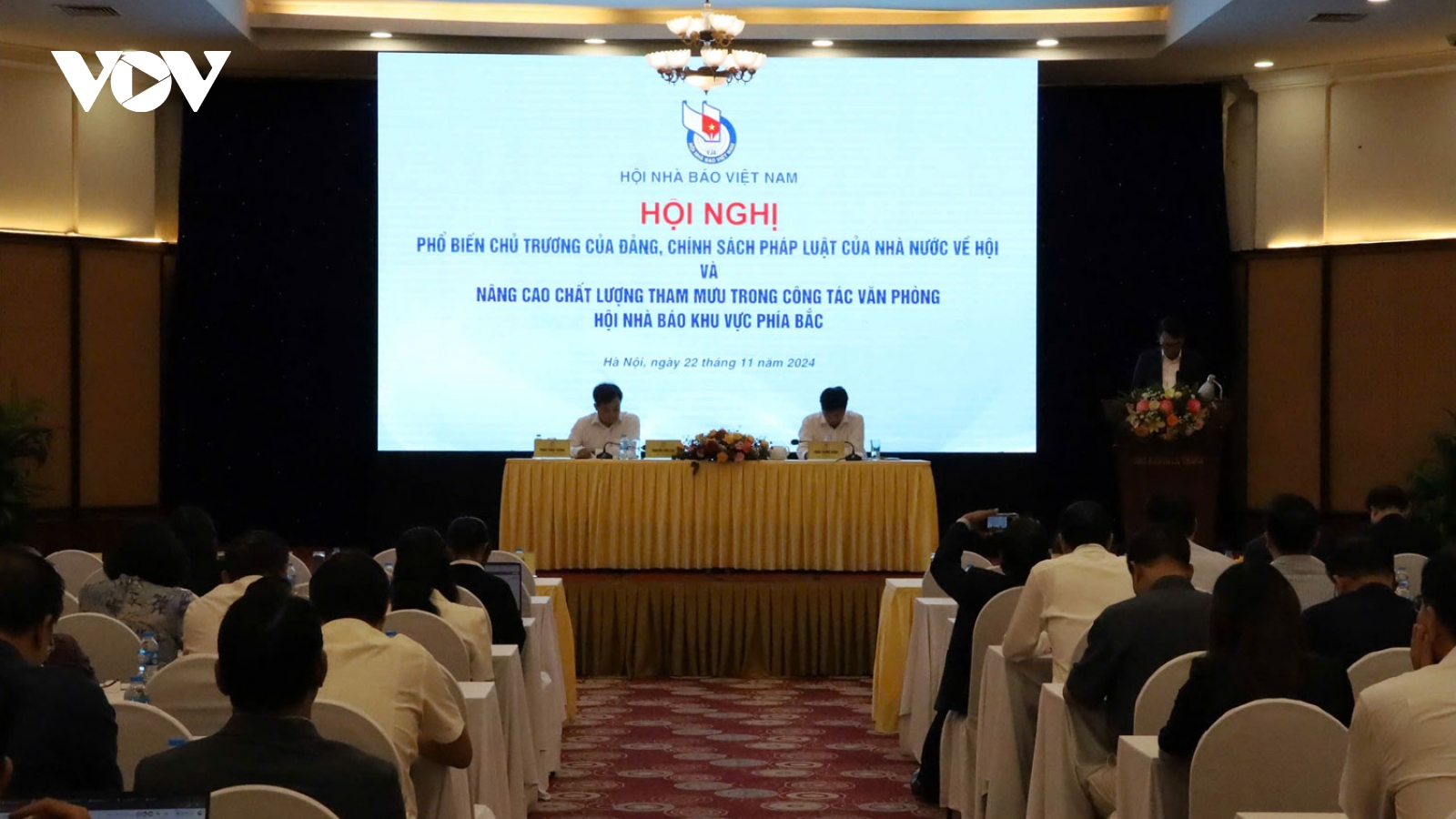 VOV.VN - Chiều 22/11, Hội Nhà báo Việt Nam tổ chức Hội nghị Phổ biến chủ trương của Đảng, chính sách pháp luật của Nhà nước về hội và nâng cao chất lượng tham mưu trong công tác văn phòng Hội Nhà báo khu vực miền Bắc.