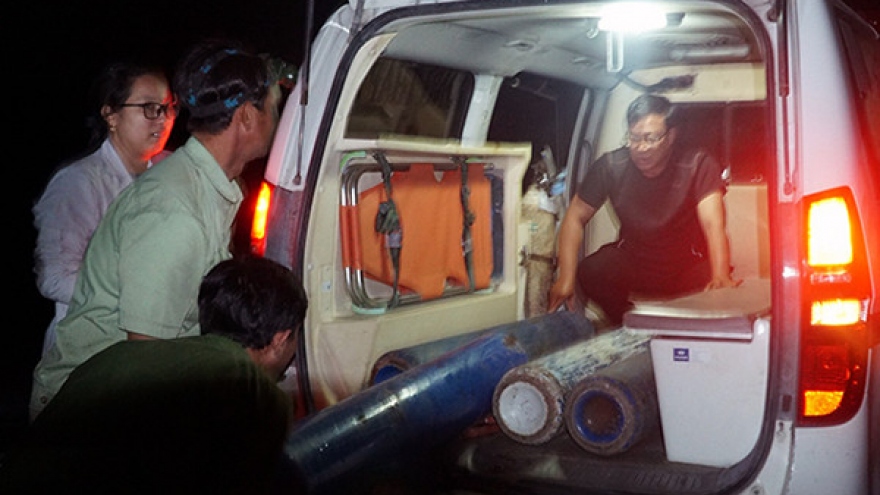 VOV.VN - Lực lượng cứu hộ vẫn truyền oxy và truyền nước xuống nhưng chưa thấy nạn nhân dùng đến nước. Các lực lượng vẫn tiếp tục tăng cường bình oxy để xử lý khi cháu bé được đưa lên, xe cứu thương cũng được đưa đến hiện trường