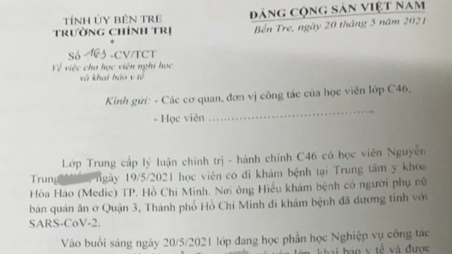 VOV.VN - Hôm nay (21/5), lãnh đạo trường Chính trị tỉnh Bến Tre cho biết, vừa cho 1 lớp học và 1 giáo viên của trường nghỉ và tự cách ly tại nhà vì trong lớp học này có 1 học viên có tiếp xúc với bệnh nhân mắc Covid-19 tại TP HCM.