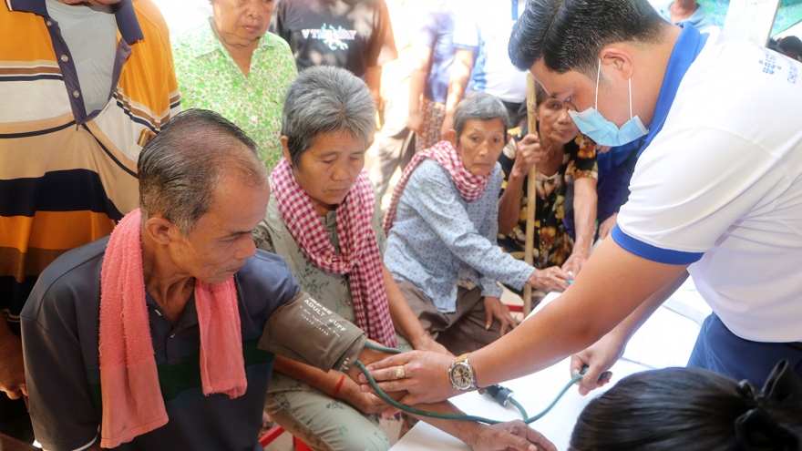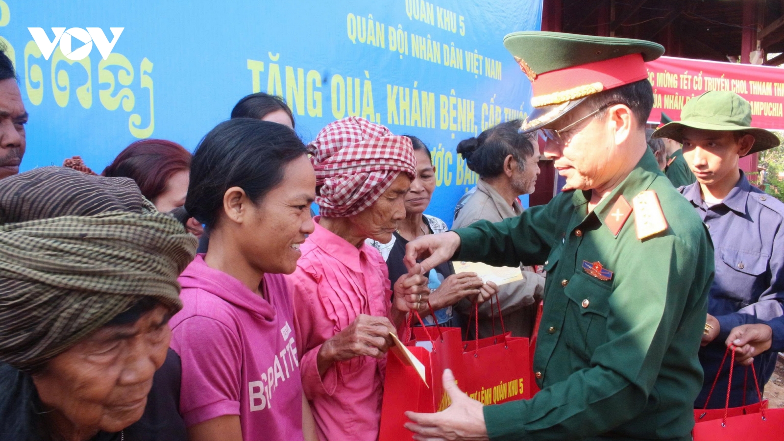 VOV.VN - Người dân Campuchia đang hân hoan đón Tết cổ truyền Chol Chnam Thmey. Dịp này, Đoàn công tác Quân khu 5, Quân đội nhân dân Việt Nam đã có chuyến thăm, tặng quà, khám bệnh miễn phí bà con vùng biên giới tỉnh Ratanakiri, Campuchia.