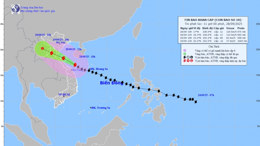 VOV.VN - Lúc 10h ngày 28/9, tâm bão số 10 ở trên vùng biển Quảng Trị - Đà Nẵng, sức gió mạnh cấp 12, giật cấp 15. Dự báo trong 12–36 giờ tới, bão tiếp tục gây gió mạnh, sóng lớn, nước biển dâng 0,5–1,5m và mưa to đến rất to tại Bắc Bộ và Bắc Trung Bộ.
