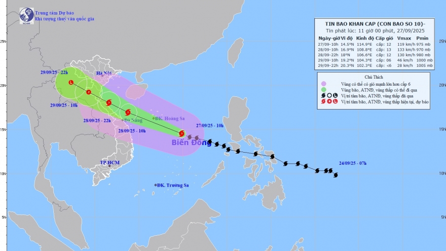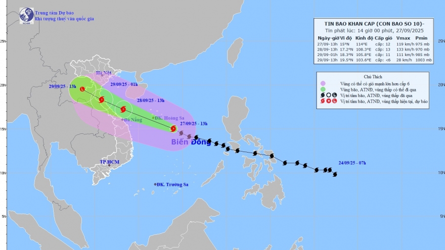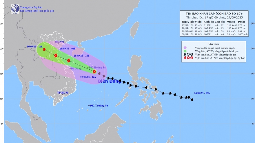 VOV.VN - Theo Trung tâm dự báo Khí tượng Thủy văn quốc gia, vị trí tâm bão số 10 lúc 13h ngày 27/9 cách đặc khu Hoàng Sa khoảng 270km về phía Đông Đông Nam. Cường độ cấp 11-12 (103-133km/h), giật cấp 15. Bão di chuyển theo hướng Tây Tây Bắc, tốc độ khoảng 30-35 km/h.