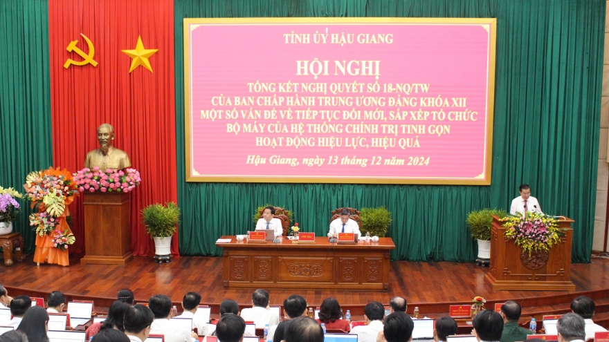 VOV.VN - Ngày 13/12, Tỉnh ủy Hậu Giang tổ chức Hội nghị tổng kết Nghị quyết số 18 của Ban Chấp hành Trung ương Đảng khóa XII “Một số vấn đề về tiếp tục đổi mới, sắp xếp tổ chức bộ máy của hệ thống chính trị tinh gọn, hoạt động hiệu lực, hiệu quả”.