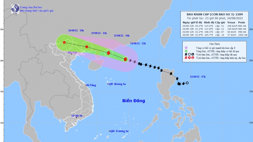 VOV.VN - Vùng nguy hiểm do bão trên Biển Đông trong 24 giờ tới (gió mạnh cấp 6 trở lên, giật từ cấp 8 trở lên): từ vĩ tuyến 15,0 đến 19,5 độ Vĩ Bắc; từ kinh tuyến 113,0 đến 117,5 độ Kinh Đông.