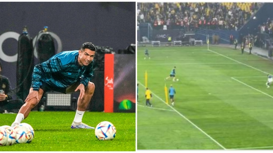 VOV.VN - Cristiano Ronaldo "muối mặt" khi đá hụt bóng trong lúc cố gắng biểu diễn kỹ thuật đánh gót ghi bàn ở buổi tập đầu tiên cùng đội bóng mới Al Nassr