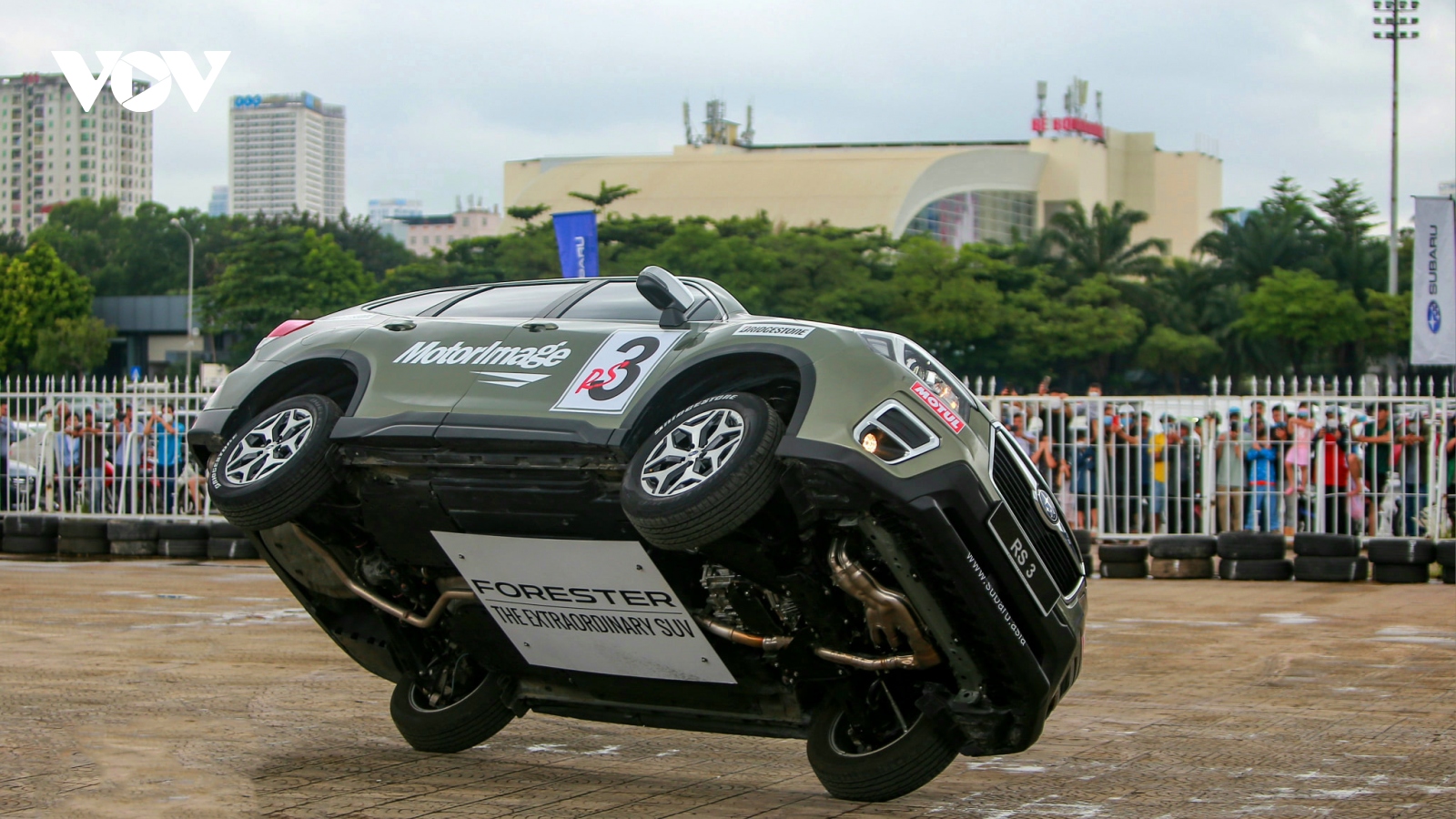 VOV.VN - Trong 2 ngày 1-2/10, kỷ lục gia Russ Swift đã có những màn biểu diễn đi ô tô 2 bánh, đỗ ngược chữ J, quay hình tròn bằng các loại xe Subaru tại sân vận động Mỹ Đình.