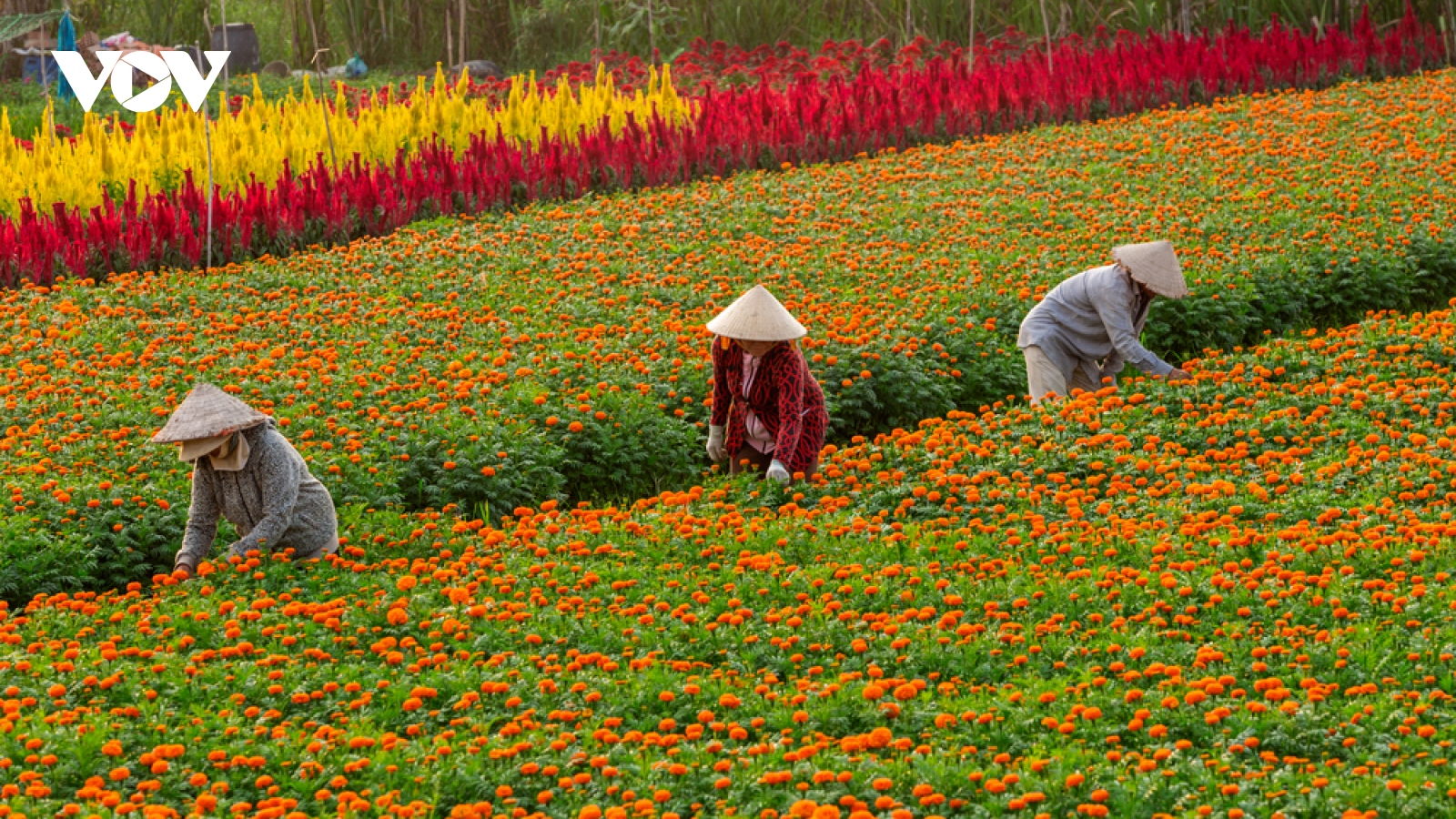 VOV.VN - Phục vụ thị trường hoa Tết cho người dân Bình Dương và các địa phương lân cận, cứ vào khoảng tháng 9 âm lịch, nông dân ở khu phố Tân Ba, phường Thái Hòa, TP.Tân Uyên, tỉnh Bình Dương lại chuyển từ trồng rau màu sang trồng hoa. Sau gần 3 tháng chăm sóc, các vườn hoa ở Tân Ba đã bắt bắt đầu bung nở.