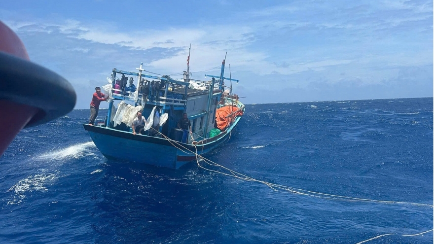 VOV.VN - Sau khi bơm hút xong nước trong khoang và tiến hành khắc phục tạm thời sự cố, tàu cá BTh 97618 TS được tàu BP 11.19.01 lai dắt về đảo Phú Quý.