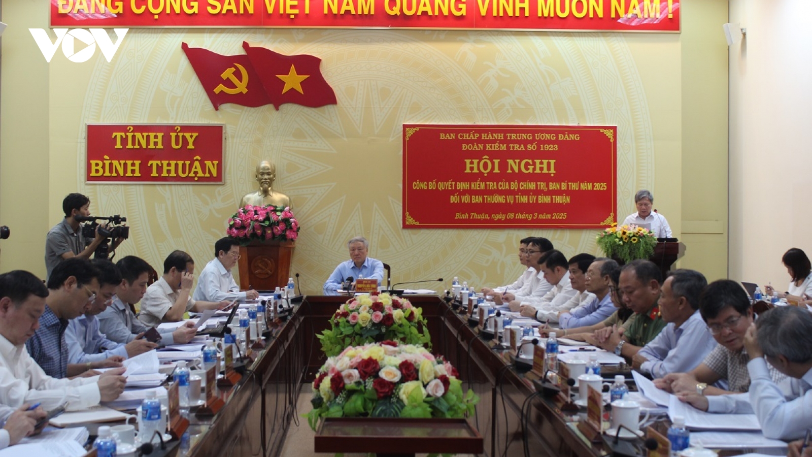 VOV.VN - Sáng 8/3, Đoàn kiểm tra số 1923 của Bộ Chính trị, Ban Bí thư do Ủy viên Bộ Chính trị, Bí thư Trung ương Đảng, Phó Thủ tướng Thường trực Chính phủ Nguyễn Hòa Bình làm Trưởng đoàn, đã có buổi làm việc với Ban Thường vụ Tỉnh ủy Bình Thuận.