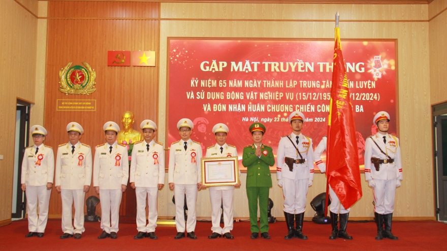 VOV.VN - Thừa uỷ quyền của lãnh đạo Đảng, Nhà nước, Thiếu tướng Nguyễn Ngọc Thanh, Phó Tư lệnh Bộ Tư lệnh Cảnh sát Cơ động đã trao Huân chương Chiến công hạng Ba cho Trung tâm Huấn luyện và sử dụng động vật nghiệp vụ.