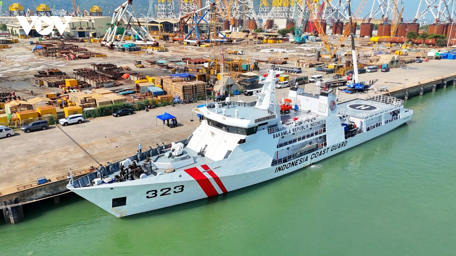 VOV.VN - Trưa 8/10, Tàu cảnh sát biển KN. Pulau Dana, số hiệu 323, Lực lượng Cảnh sát biển Indonesia cùng 54 thuyền viên, do Trung tá Umar Dhani làm Thuyền trưởng đã cập cảng PTSC, bắt đầu chuyến thăm xã giao thành phố Vũng Tàu, tỉnh Bà Rịa - Vũng Tàu.