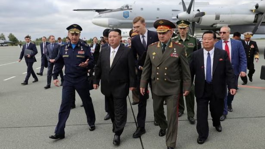 VOV.VN - Bộ Quốc phòng Nga hôm nay (16/9) cho biết, nhà lãnh đạo Triều Tiên Kim Jong Un đã thị sát các máy bay ném bom chiến lược, tên lửa siêu thanh và tàu chiến có khả năng hạt nhân, cùng Bộ trưởng Quốc phòng Nga Sergei Shoigu.