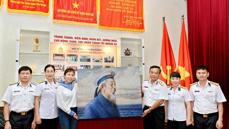 VOV.VN - Hoạ sĩ Nguyễn Thu Thuỷ đã trao tặng Bộ Tư lệnh Quân chủng Hải quân bức tranh sơn dầu "Chân dung Bác Hồ đội mũ hải quân" và phác thảo "Tranh gốm Bác Hồ".