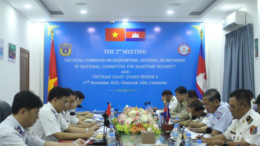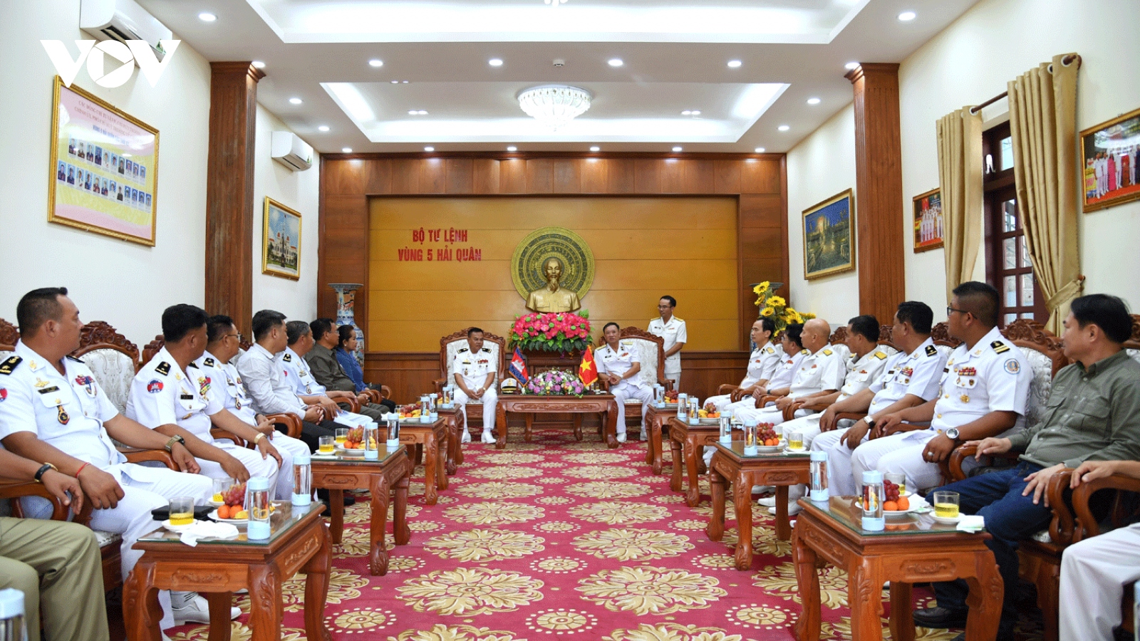 VOV.VN - Chiều 12/12, tại TP. Phú Quốc, tỉnh Kiên Giang, đoàn công tác Căn cứ biển Ream, Hải quân Hoàng gia Campuchia do Phó Đô đốc Mey Dina, Chỉ huy trưởng Căn cứ biển Ream làm trưởng đoàn đã đến chào xã giao Bộ Tư lệnh Vùng 5 Hải quân. Chuẩn Đô đốc Nguyễn Duy Tỷ, Tư lệnh Vùng 5 Hải quân chủ trì tiếp đoàn.