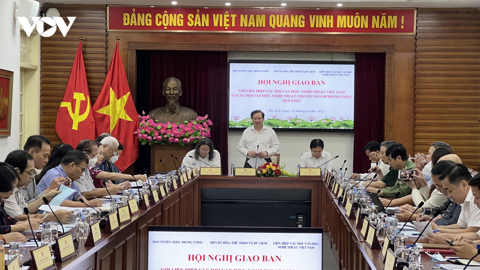 VOV.VN - Sáng 25/4, Ban Tuyên giáo Trung ương phối hợp với Bộ Văn hóa, Thể thao và Du lịch tổ chức Hội nghị giao ban với Liên hiệp các hội văn học nghệ thuật Việt Nam và các Hội Văn học nghệ thuật chuyên ngành Trung ương quý I/2022.