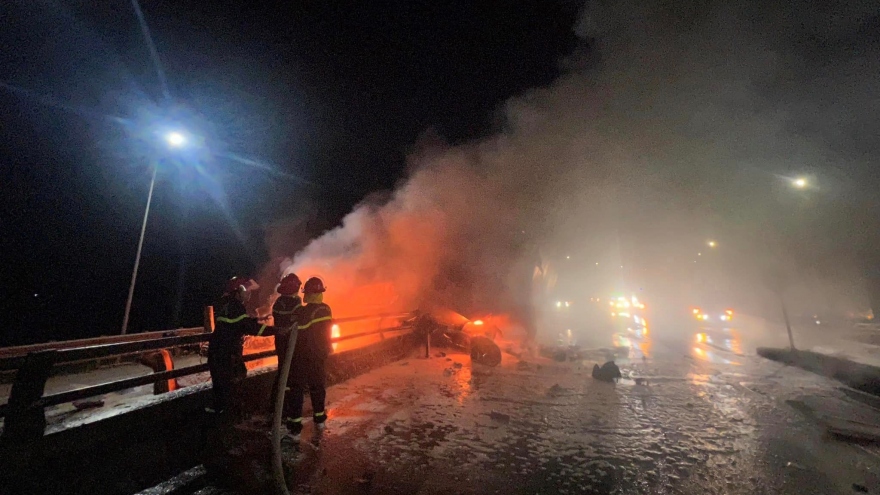 VOV.VN - Một xe đầu kéo đang đi trên tuyến cao tốc Nội Bài - Lào Cai (đoạn xã Gia Phú, huyện Bảo Thắng, Lào Cai) thì bất ngờ bốc cháy dữ dội, phần cabin thị thiêu rụi nghiêm trọng.