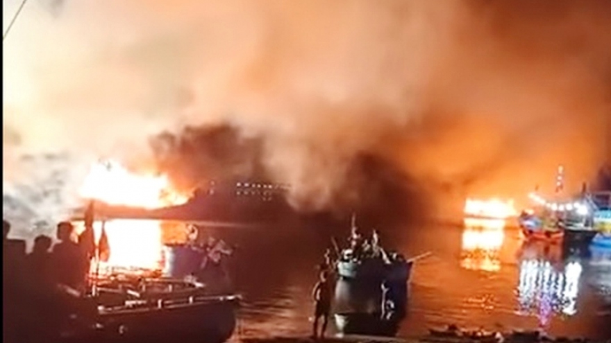 VOV.VN - Khoảng 3h sáng 1/8, 4 tàu cá của ngư dân đang neo đậu ở cửa sông Roòn, xã Cảnh Dương, huyện Quảng Trạch, tỉnh Quảng Bình bốc cháy. Chính quyền, lực lượng chức năng và người dân nỗ lực dập lửa nhưng 3 tàu bị thiêu rụi hoàn toàn.