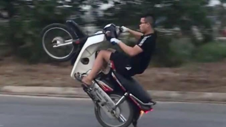 VOV.VN - Thanh niên này bị xử phạt tổng hợp nhiều lỗi, trong đó có lỗi bốc đầu chạy bằng 1 bánh đối với xe hai bánh; buông hai tay, dùng chân trái để lái xe đổ đèo...