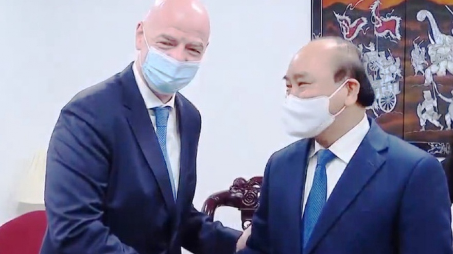 VOV.VN - Chủ tịch nước Nguyễn Xuân Phúc bày tỏ tán thành với quan điểm của FIFA về việc rút ngắn thời gian tổ chức Worlcup và mong muốn FIFA hỗ trợ Việt Nam trong đào tạo, phát triển bóng đá.