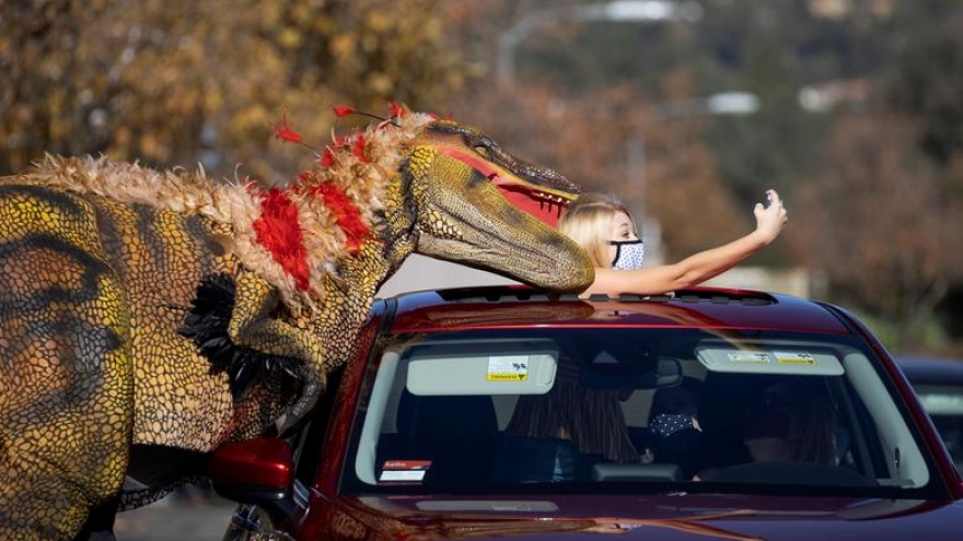 VOV.VN - Con vượn đi giữa "phố", khủng long "ngoạm" đầu cô gái, học trực tuyến giữa đàn dê hay cặp đôi khóa tay nhay bằng dây xích... là những bức ảnh “kỳ quặc” nhất trong năm 2021.