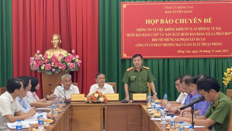 VOV.VN - Chiều 26/12, Ban Tuyên giáo Tỉnh ủy Đồng Nai tổ chức họp báo về việc không khởi tố vụ án hình sự về các tội “Buôn bán hàng cấm” và “Sản xuất, buôn bán hàng giả là phân bón” đối với những vi phạm xảy ra tại Công ty cổ phần thương mại và sản xuất Thuận Phong (Công ty Thuận Phong, phường Long Bình, TP.Biên Hòa).