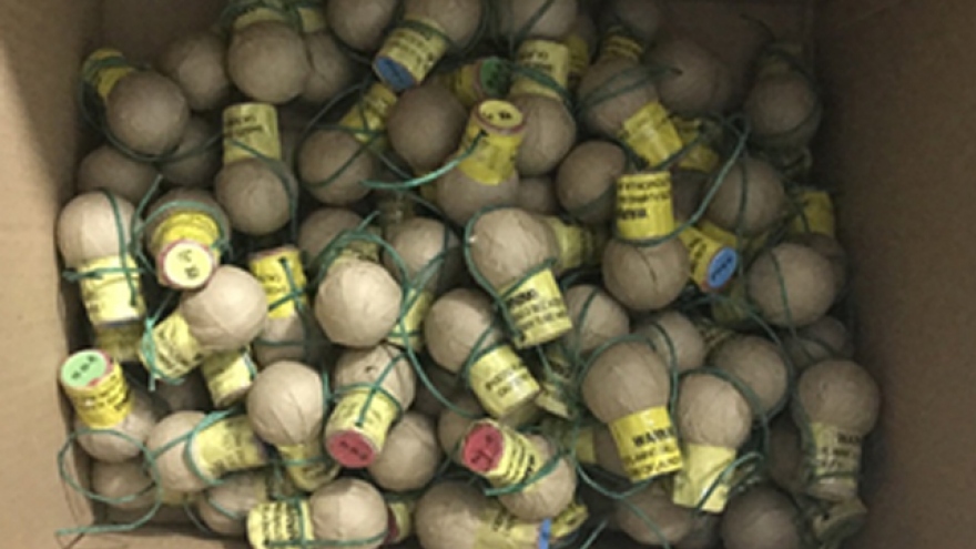 VOV.VN - Tang vật thu giữ gồm 5 hộp pháo hoa nổ (tổng trọng lượng hơn 30kg); 1 bánh pháo nổ (hơn 1 kg); 16 quả pháo nổ tự tạo cugf một số vật dụng để chế tạo pháo nổ.