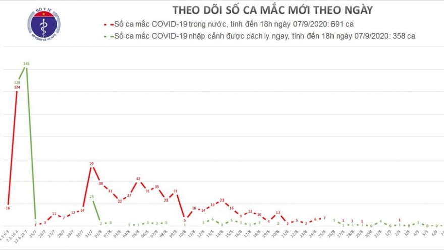 VOV.VN - Tính đến 18h ngày 7/9, Việt Nam có 691 ca mắc COVID-19 do lây nhiễm trong nước, trong đó số lượng ca mắc mới tính từ ngày 25/7 đến nay là 551 người.