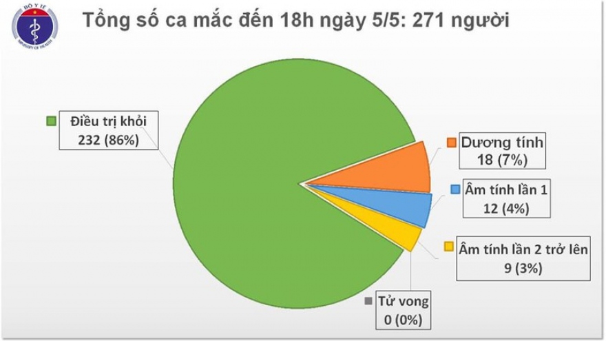 VOV.VN -Đến 18h chiều 5/5, Việt Nam tiếp tục không có ca mắc Covid-19 mới. Hiện tổng số ca mắc vẫn là 271. Hai bệnh nhân nặng (BN161, BN19) có tiến triển tốt.