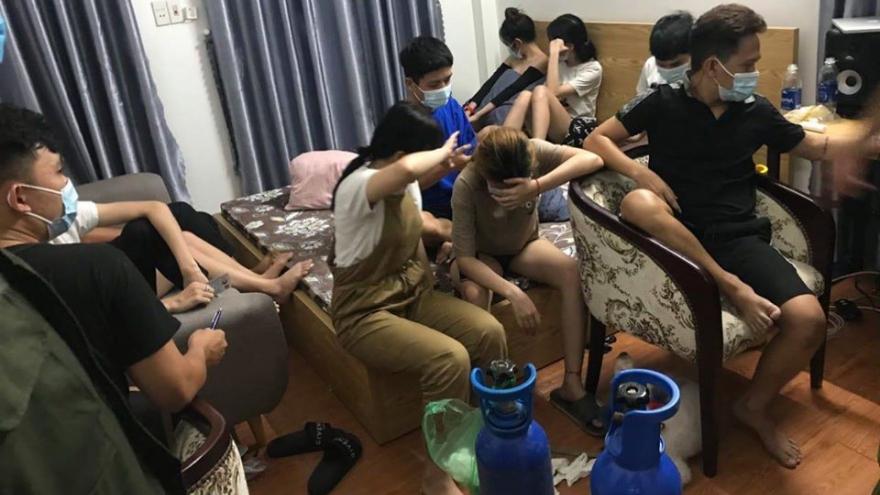 VOV.VN - Kiểm tra hành chính căn nhà trên địa bàn phường, Công an phường Mân Thái phát hiện 11 người gồm 6 nam, 5 nữ đang tụ tập ăn nhậu và hút bóng cười