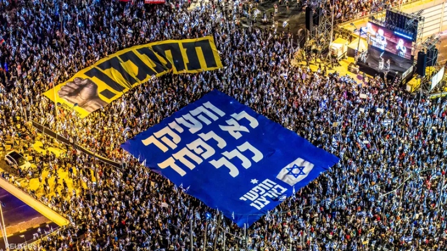 VOV.VN - Hàng chục nghìn người Israel đã biểu tình vào tối 8/7, tuần thứ 27 liên tiếp, tại trung tâm Tel Aviv và các thành phố khác để phản đối một cuộc cải cách tư pháp của chính phủ.