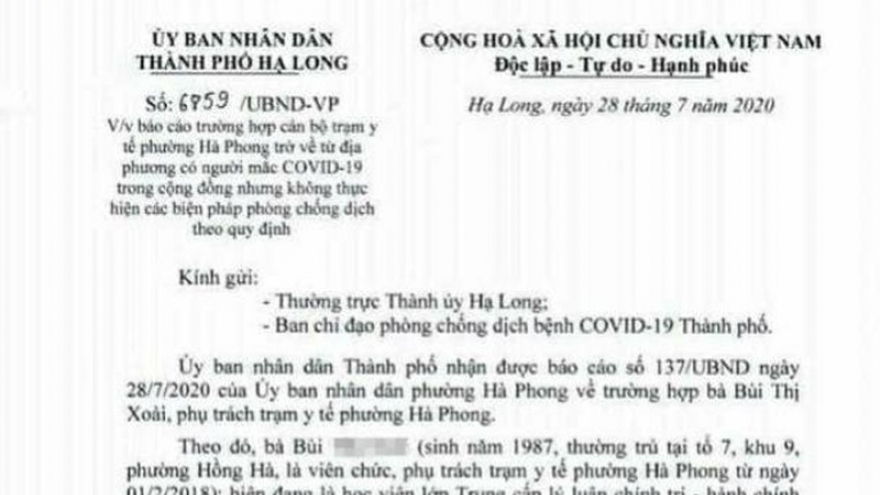 VOV.VN - UBND TP Hạ Long (Quảng Ninh) vừa quyết định tạm thời ngừng hoạt động trạm Y tế phường Hà Phong, vì nữ cán bộ tại đây khai báo y tế không trung thực.