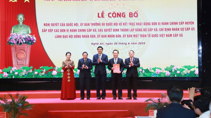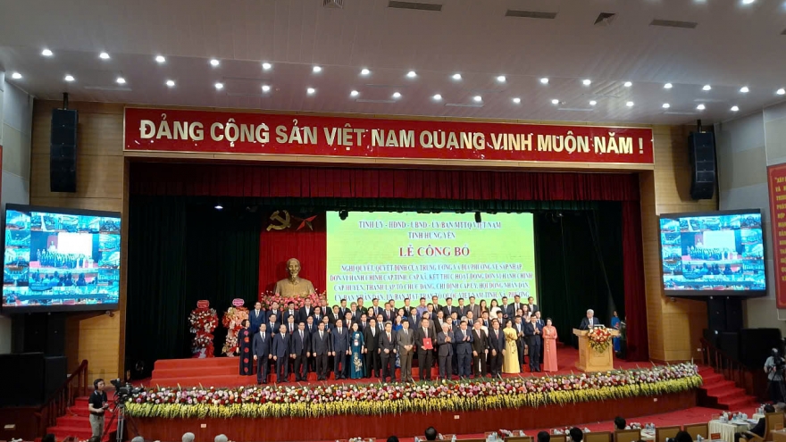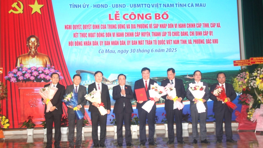 VOV.VN - Sáng 30/6, tỉnh Cà Mau tổ chức công bố Nghị quyết, Quyết định của Trung ương và địa phương về sắp xếp đơn vị hành chính cấp tỉnh, cấp xã; kết thúc hoạt động đơn vị hành chính cấp huyện; thành lập tổ chức đảng, chỉ định Cấp ủy, HĐND, UBND, Ủy ban MTTQ Việt Nam tỉnh, xã, phường của tỉnh Cà Mau.