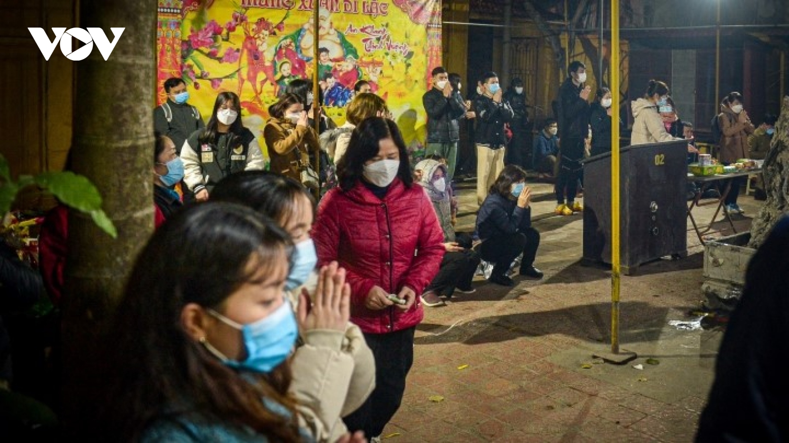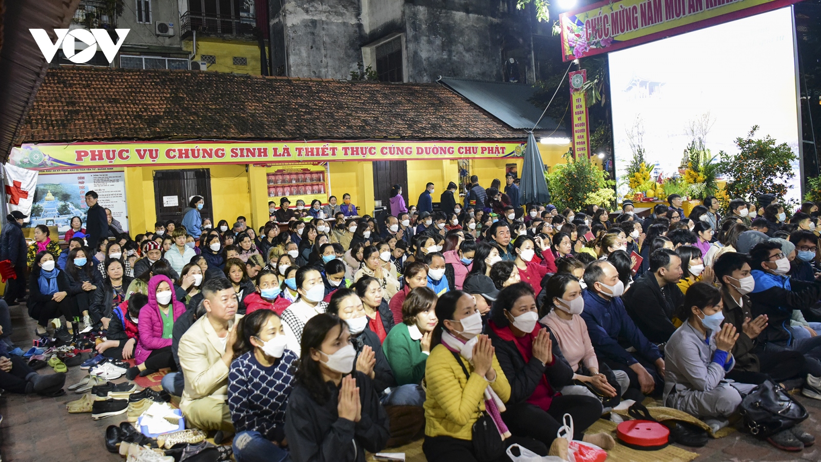 VOV.VN - Tối 4/2 (tức 14 tháng Giêng) tại Tổ đình Phúc Khánh (quận Đống Đa, TP. Hà Nội) diễn ra đại lễ cầu an đầu năm Quý Mão 2023. Hàng trăm người dân ngồi chật kín khuôn viên chùa chờ sư thầy làm lễ.
