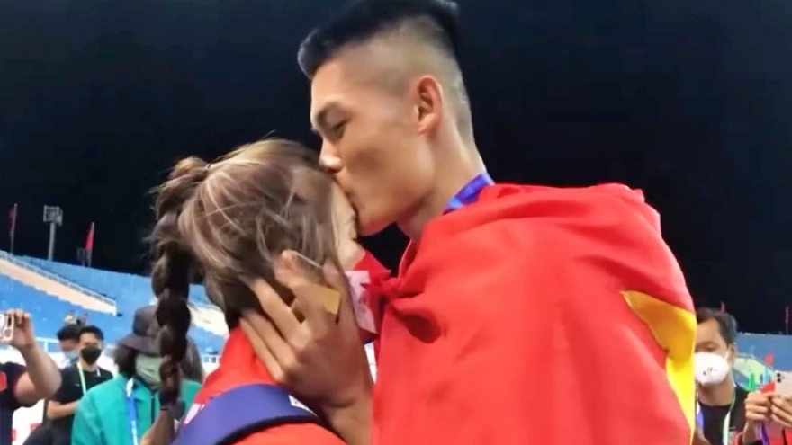 Vừa bước xuống từ bục nhận huy chương, cầm tấm huy chương vàng trong tay, Tiến Trọng bất ngờ quỳ xuống, rút nhẫn cầu hôn bạn gái là Nguyễn Thị Phương Trinh - VĐV của đội tuyển cầu mây Việt Nam.