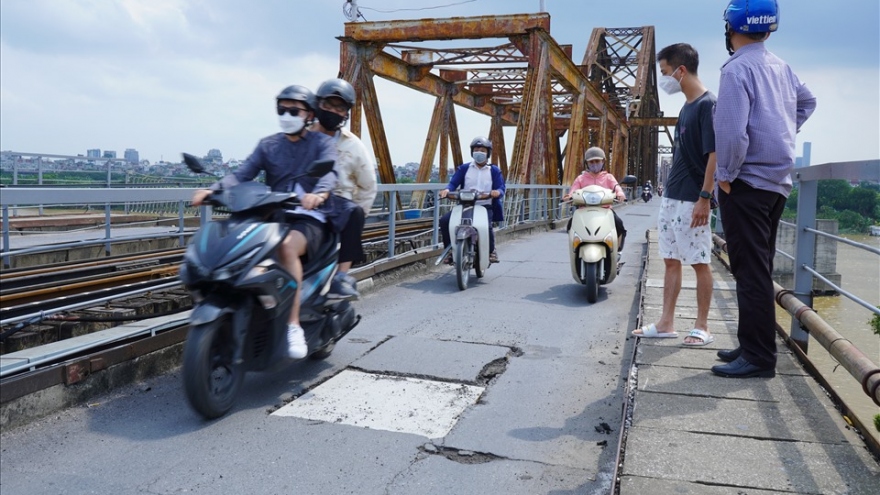 VOV.VN - Bộ GTVT yêu cầu Cục Đường sắt Việt Nam, Tổng công ty Đường sắt Việt Nam khẩn trương khắc phục ngay hư hỏng, thủng mặt cầu Long Biên, rà soát tổng thể các hạng mục cần đầu tư báo cáo Bộ GTVT.