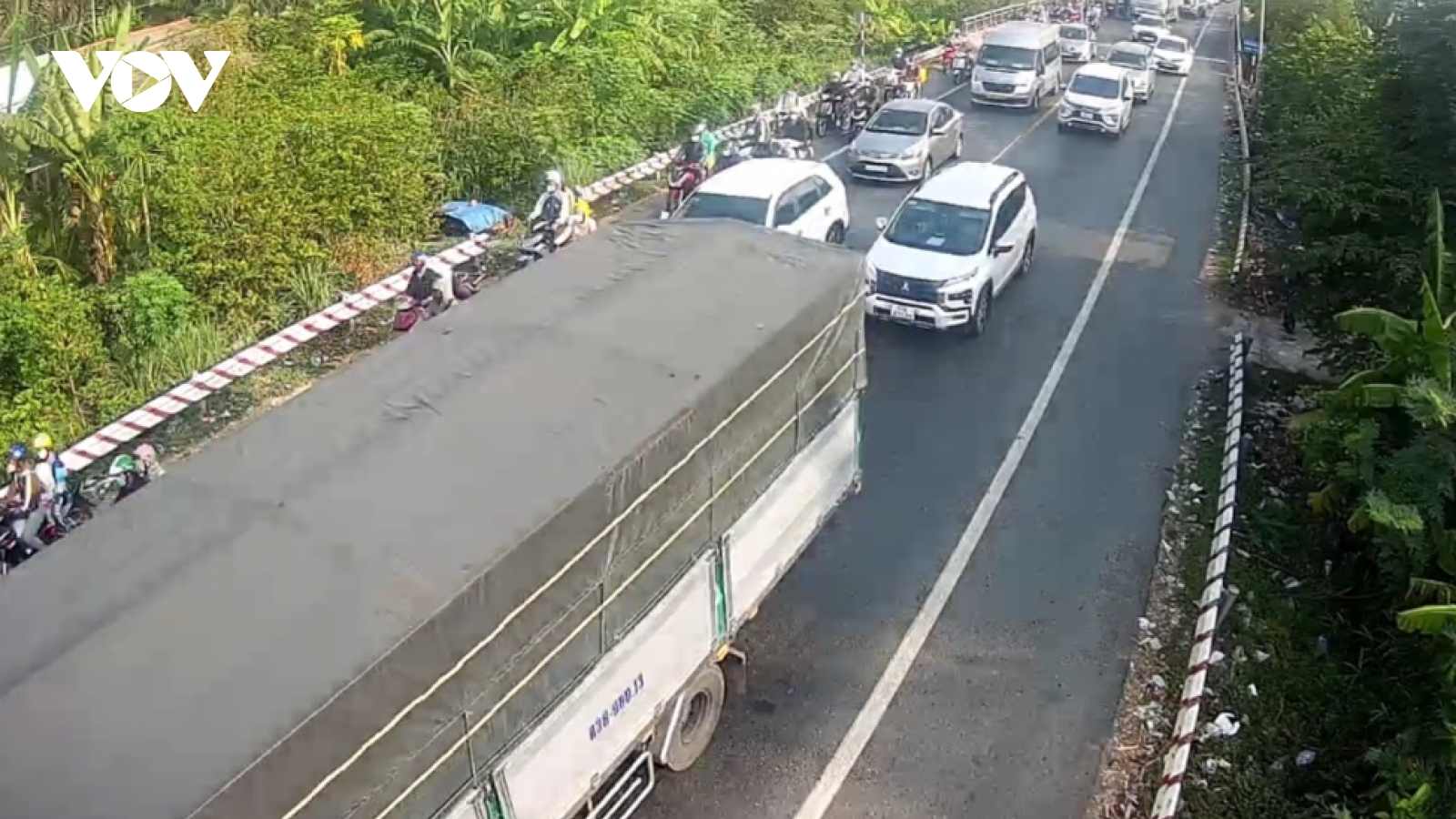 VOV.VN - Hôm nay (6/4), do nhiều người dân đi chơi đợt Lễ giỗ Tổ Hùng Vương nên mật độ phương tiện qua lại cầu Rạch Miễu tăng cao dẫn đến ùn ứ giao thông khu vực này.