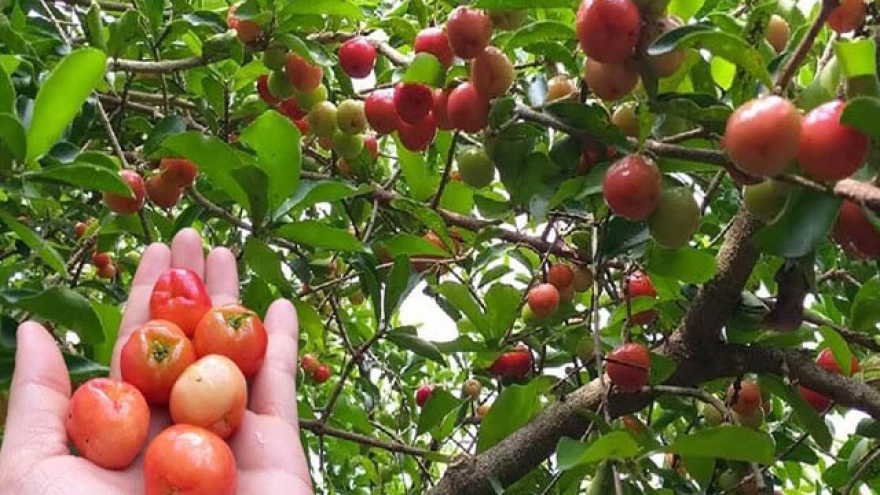 VOV.VN - Cây sơ ri từ lúc trồng đến thu hoạch mất 6 tháng. Mỗi đợt thu hoạch cách nhau khoảng nửa tháng, đặc biệt, cây sơ ri càng lâu năm thì trái càng sai.