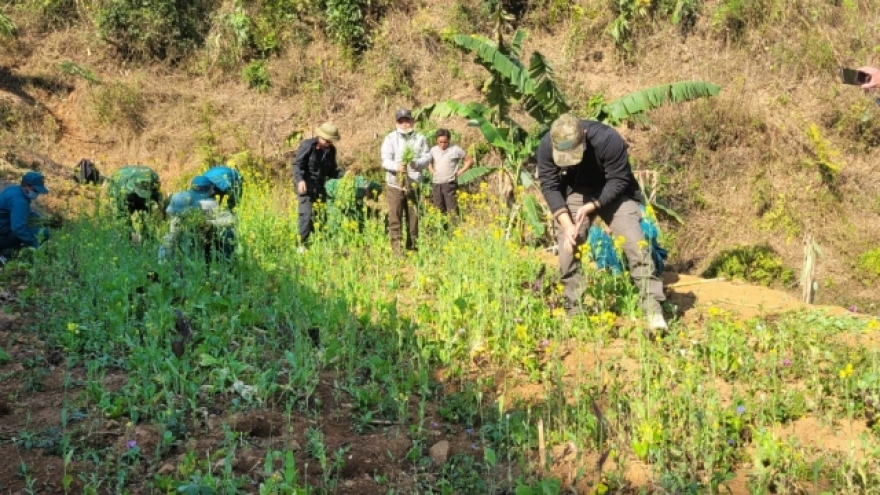 VOV.VN - Công an xã Khánh Xuân vừa phối hợp với Công an xã Xuân Trường, Đồn Biên phòng Xuân Trường và Công an huyện Bảo Lạc, tỉnh Cao Bằng phá nhổ hơn 8.000 cây thuốc phiện được trồng trái phép trong một thung lũng.