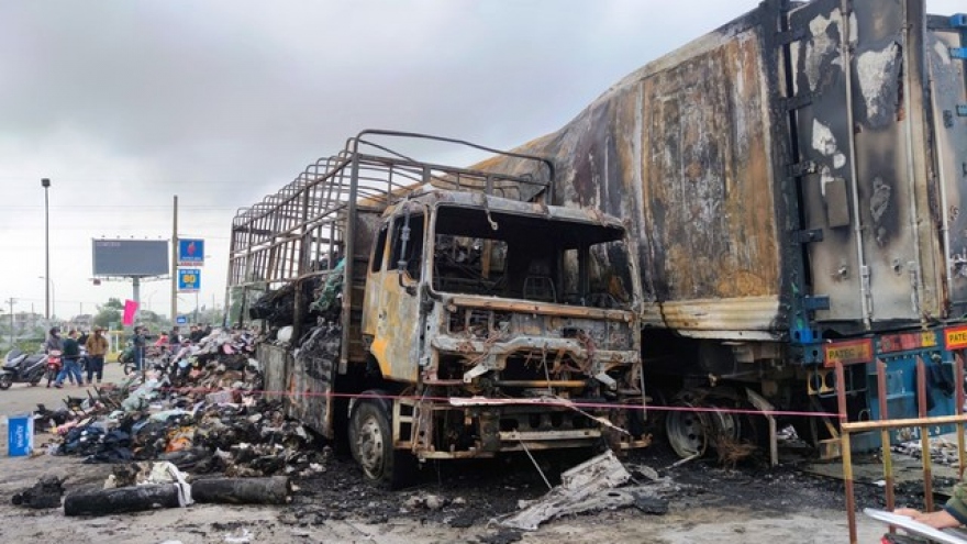 VOV.VN - Rạng sáng nay (16/2), tại thị trấn Nam Phước, huyện Duy Xuyên, tỉnh Quảng Nam, xe tải chở hàng và xe đầu kéo đang đậu phía trước 1 cây xăng thì bất ngờ bốc cháy dữ dội.