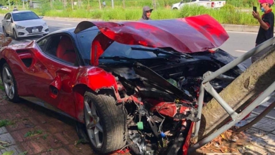 VOV.VN - Chiếc xe đắt tiền màu đỏ đang đi trên phố ở quận Long Biên (Hà Nội) bất ngờ lao lên vỉa hè, tông đổ cây xanh, đầu xe hư hỏng nặng, may mắn không có người bị thương.