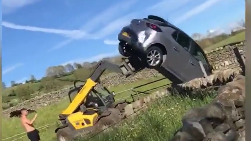 VOV.VN - Một nam giới đỗ xe hơi chặn ngay trước cổng của một người nông dân. Thế là người nông dân cáu tiết dùng xe nâng hàng để hất và đổ xe ô tô ra chỗ khác bất chấp việc quay phim và hành động đạp đá của người đàn ông kia. Sự việc xảy ra tại Durham (Anh Quốc).