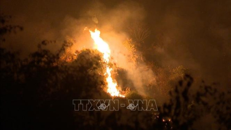 VOV.VN - Do địa hình rừng núi phức tạp, vách đá dựng đứng nên các lực lượng chỉ có thể tiếp cận từ xa và làm đường băng cản lửa để phòng tránh lửa lan rộng.