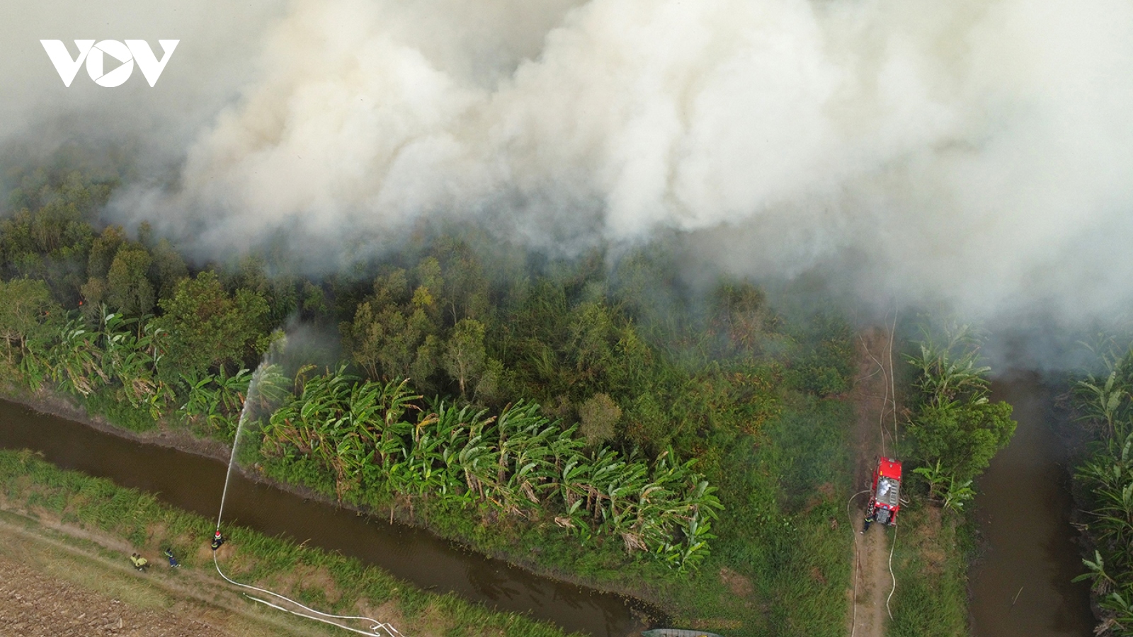 VOV.VN - Đám cháy ở Nông trường 402 đã cơ bản được khống chế, tuy nhiên, các lực lượng liên quan vẫn còn tiếp tục túc trực trên địa bàn để theo dõi, xử lý các khu vực cháy nhỏ và đảm bảo phần cháy ngầm không tiếp tục gây cháy trở lại.